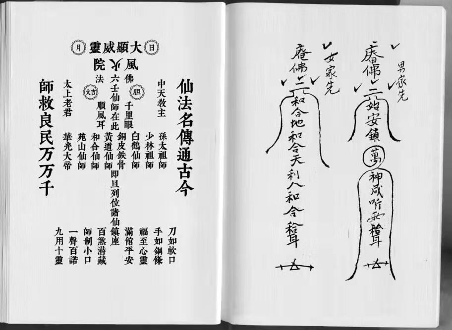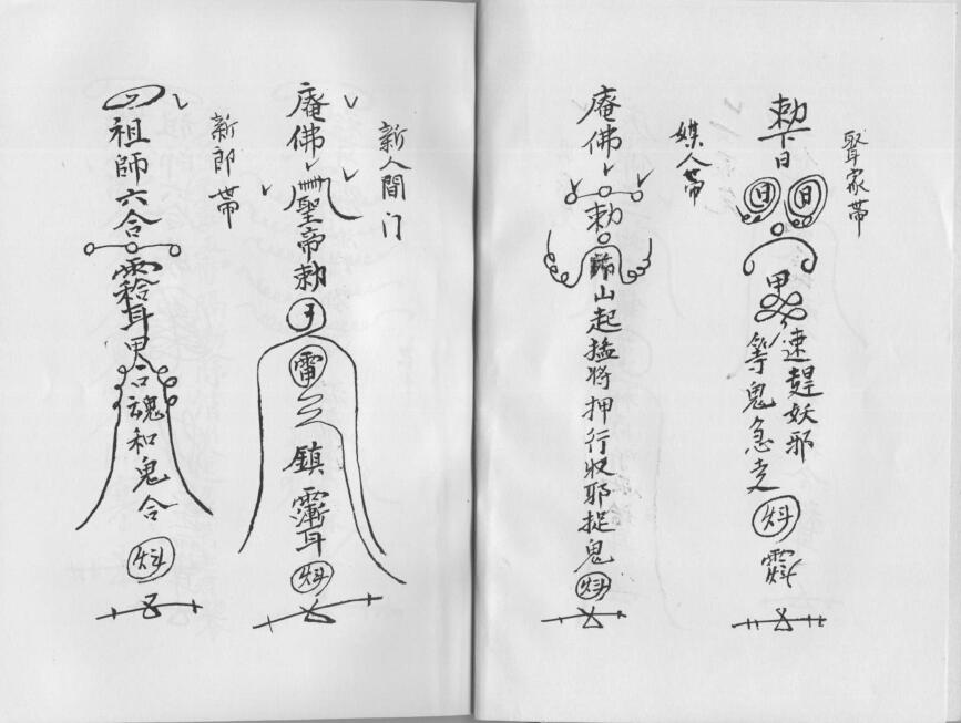 男家先 女家先 娶家带 媒人带 新人问门 新郎带 新人带 五雷发冷符 制伤神恶煞并庙堂开光 师公神诞 学神公奉香咒 请八仙下凡身开肚答仔咒 勅枪勅符合用 行夜路念咒 化百骨在东方念咒